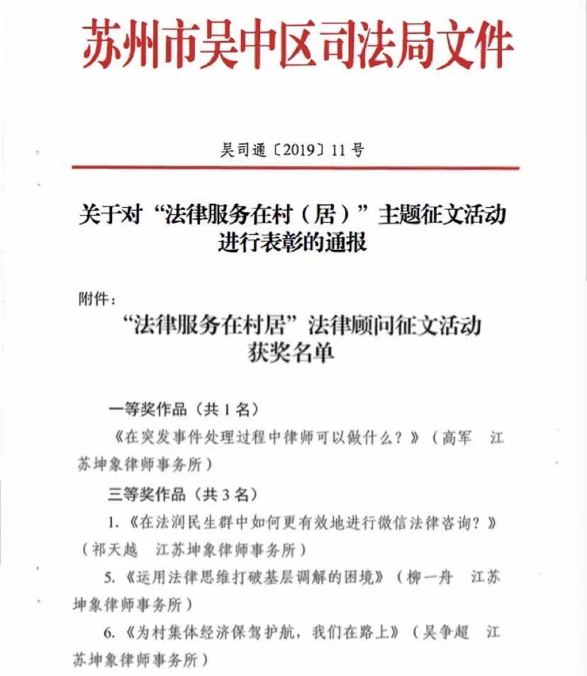 2019年3月14日,苏州市吴中区司法局下发《关于对“法律服务在村(居)”主题征文活动进行表彰的通报》(吴司通〔2019〕11号),坤象所投稿四篇皆成功获奖,其中高军主任《在突发事件处理过程中律师可以做什么?》一文获一等奖,祁天越律师获三等奖,柳一舟律师和吴争超律师获优秀奖。