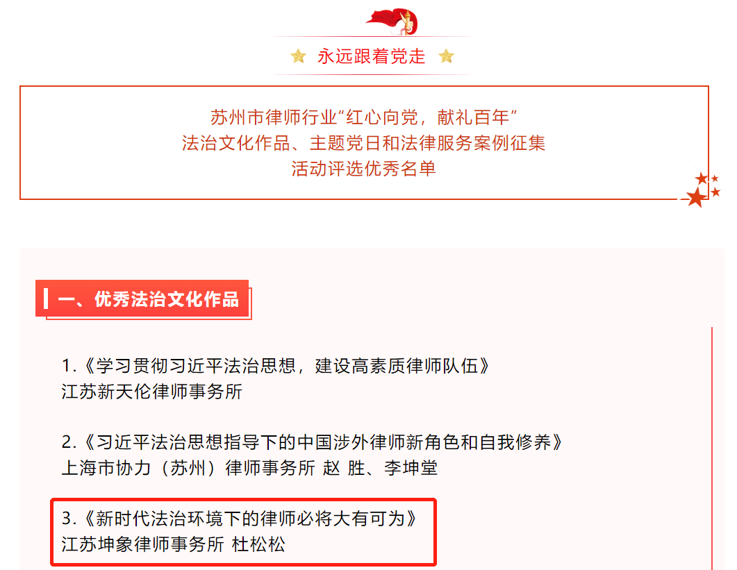 此次评选活动由市律师行业党委和吴中区法治办组织,为庆祝中国共产党建党100周年,热烈歌颂中国共产党百年光辉奋斗历程和伟大历史成就,进一步深化党史学习教育,激励和引导我所律师砥砺初心使命,汲取奋进力量,江苏坤象律师事务所始终紧跟党的步伐,坚守党的意志,坚持以党建为引领,充分发挥律师的优势,为全面建设法治新中国贡献力量!