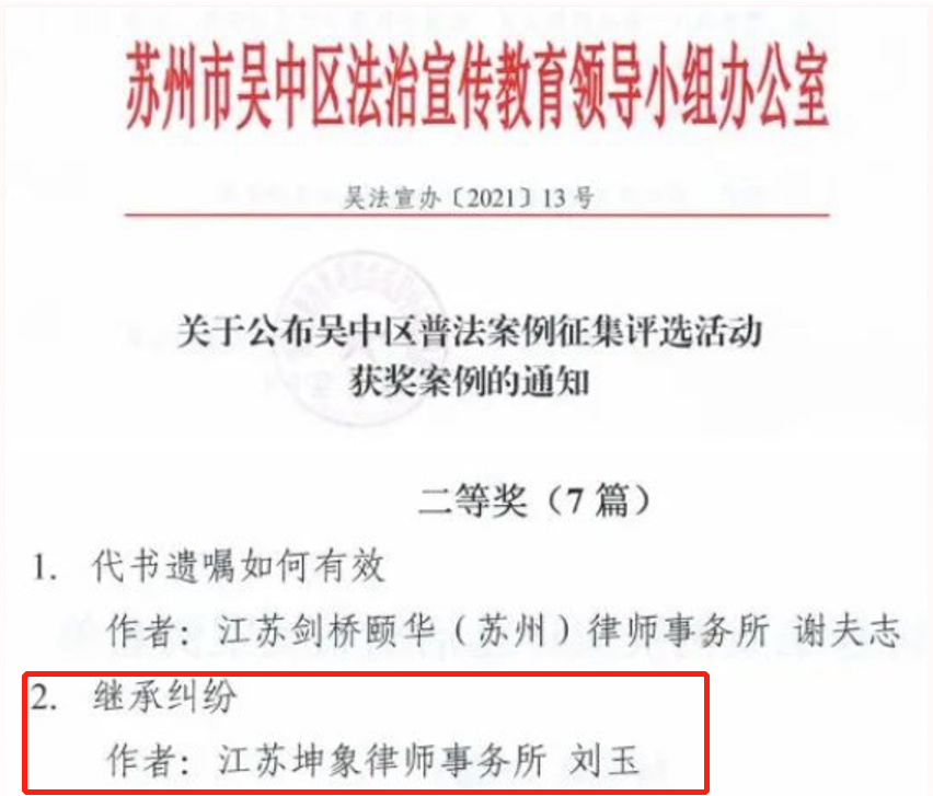 为进一步落实“谁执法谁普法”责任制,构建“以案释法”长效机制,增强市民的法治意识和法律素养,区法宣办决定在全区范围内开展普法案例征集评选活动,我所刘玉律师撰写的《继承纠纷》普法案例获评2021年度吴中区普法案例征集评选活动二等奖。